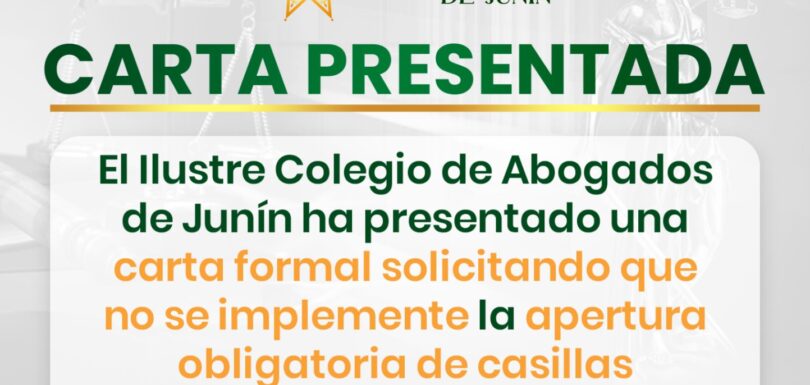 El Ilustre Colegio de Abogados de Junín presentó una carta formal a la Corte Superior de Justicia de Junín solicitando que no se implemente la apertura obligatoria de casillas judiciales físicas, en defensa del ejercicio profesional, la economía de los agremiados y la modernización del sistema judicial.