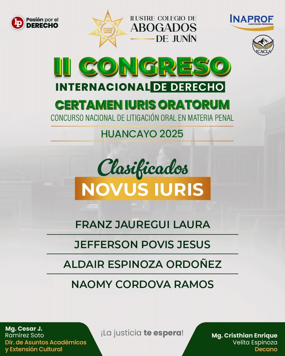 Este certamen es posible gracias al trabajo conjunto de LP Pasión por el Derecho, INAPROF e ICACLA, con el respaldo del Ilustre Colegio de Abogados de Junín.